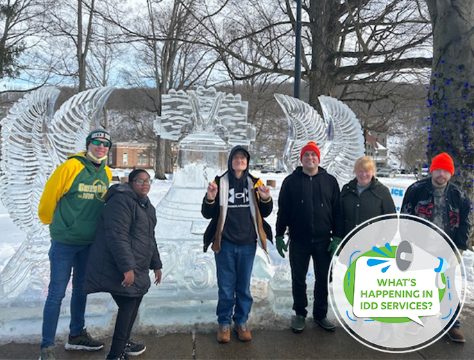 A group from the Slippery Rock Program Center went to Franklin on Ice to check out the various ice sculptures and were amazed at the size of them. Individuals were able to hold a couple of them and found out that ice can be heavy. A few brave folks tried the ice slides, and everyone had a wonderful time